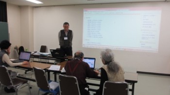 | 第111回開催 | 2日目 | 開催日2011年9月24日 土曜日 | 受講者4名 | 小澤講師 | サポーター4名 | 報告内容: ・Webページの見方について説明 ・天気のピンポイント予報、路線で目的地までの時間・運賃等、姓名分布(自分の姓)、地図から目的地を探す(受講者の番地で)操作を行い、その画面をプリントアウトし、持ち帰ってもらった。 ・出来ばえに、各自が喜んで頂いた。 ・受講者に操作してもらう事に重点を置きました。 ・結果は動機付けになったと思います。 |